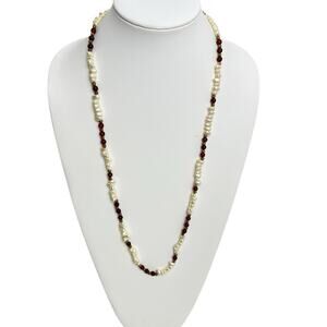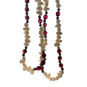 Continuous Beaded Necklace Faux Pearl Gold Tone Red Round Translucent Glass Boho