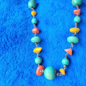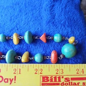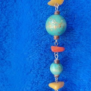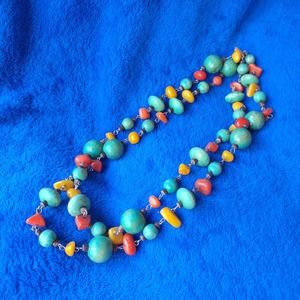 Southwestern color pop necklace that is a continuous strand that can be doubled. It has chunky turquoise wooden beads with gold splatter paint and some colored stone chip pieces throughout. It is in great condition.