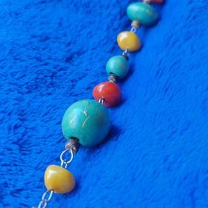 Continuous Strand Station Turquoise Wooden Bead Gem Stone Necklace