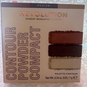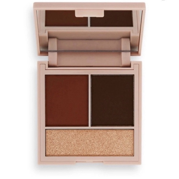Three-shade compact powder palette. Includes warm matte brown, deep matte brown, and shimmering gold.