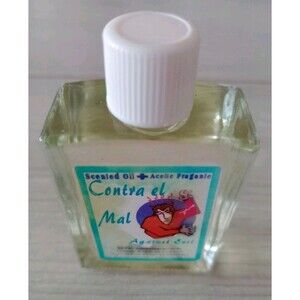 Contra el Mal "Against Evil" scented oil, 1 Fl. Oz. Full bottle. Another oil leaked on the label, but this bottle is full. Intended for protection or to ward off negativity. Used in diffusers, for personal fragrance, or in homemade products like soaps or candles.