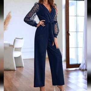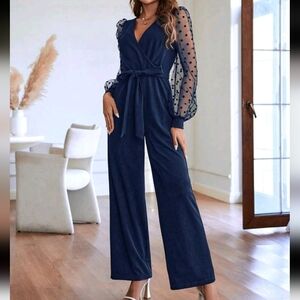 Contrast Dobby Mesh Lantern Sleeve Belted Jumpsuit