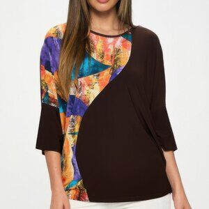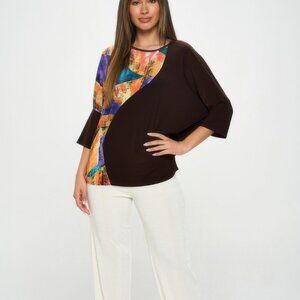 Add dimension to your everyday look with this contrast print top. Crafted from ultra-soft ITY fabric, it features a mix of bold prints and solid accents for a balanced, fashion-forward feel. With a flattering cut and lightweight drape, it’s an effortless go-to for layering or solo styling. Made in the USA.