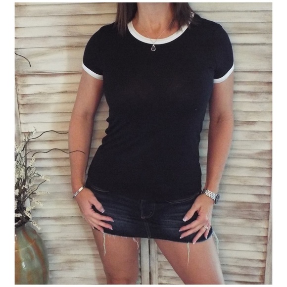 Contrast Trim Crew Neck Top Black Ivory 2419