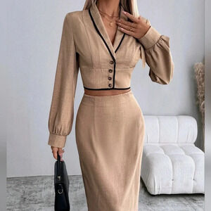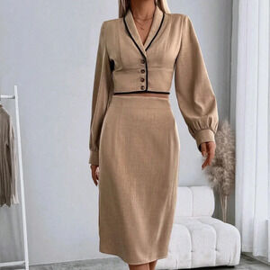 Contrast Trim Puff Sleeve Button-Up Bodycon Dress Women