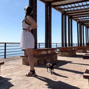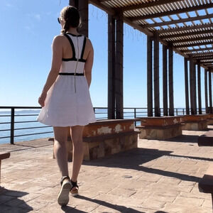 White dress with black trim and a contrast zipper closure. Beautiful texture. Fully lined. Poly rayon. Wore twice. Bust 17.5” and length 34”
