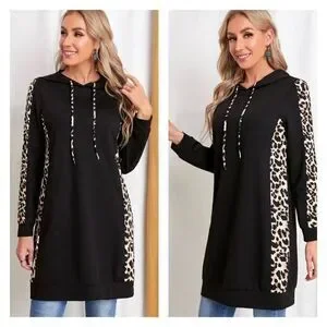 Contrast Leopard Panel Drawstring Hoodie/Tunic