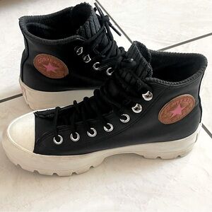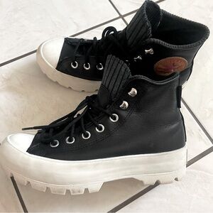 Converse All Start Chuck Taylor Leather sneakers shoes, high top, waterproof, lace up, very soft and comfy leather, soft lining fabric insole. Excellent preowned condition, gently used, some scratches, mark, signs of wear. Runs large, fit like size 7