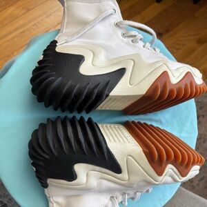 Elevate your look with these Converse high-tops. Bold white and tan design. Ideal for casual wear. Love these! Good condition ( not new, a few blemish) I am sure you can throw it in the wash if needed. Real cool Converse. No shoe inserts!! Please see pictures