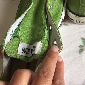 “No Lace Converse” Green, These are Youth size 3. In great condition, and still have a lot of wear to them left. I have other colors, check out my closet and save on a bundle!
