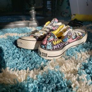 Womens size 7 converse, "music is my life" edition. Minor scuff on the front of the right shoe.
