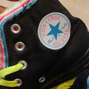 Vintage style Converse. Worn worn 1x. Fun brightly colored fabric accents and neon colored shoe laces. Hi-top style. Careful, compliments will occur while wearing.