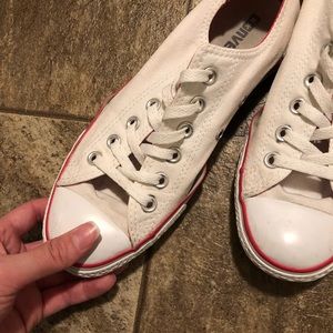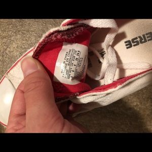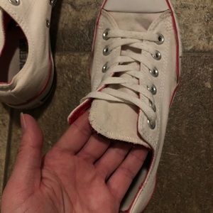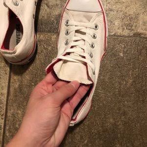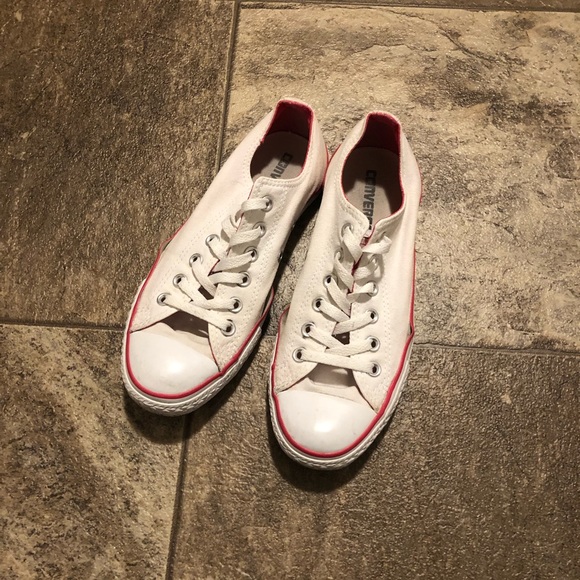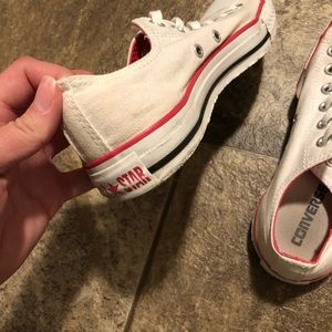 Low top. White with pink detailing. The rubber is separated from the canvas near where the toes bend. Some spots (pictured).