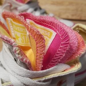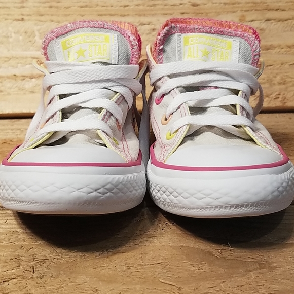 Off white with pink, orange and yellow. Normal wear, no major flaws.