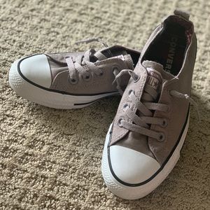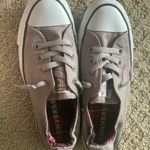 Grey converse with maroon plaid material inside. The ankles are wrinkled because they are a fit to your foot type of converse where you don’t have to tie the laces. Slip on converse, in great condition. Only been worn once or twice.