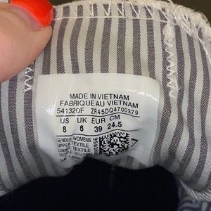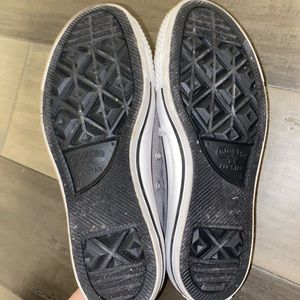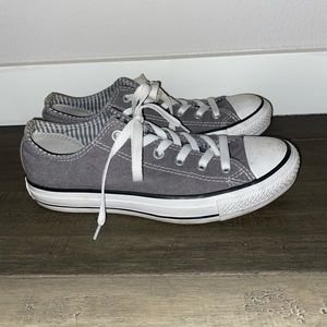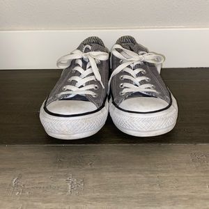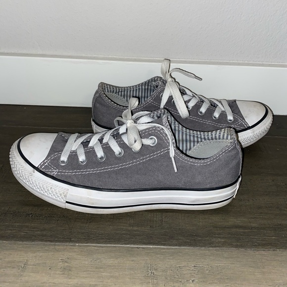 Grey converse with stripes and stars inside that can be seen when you pull the tongue back. Comfortable. Everyday wear.