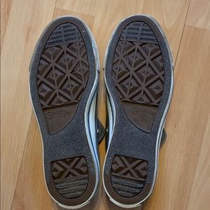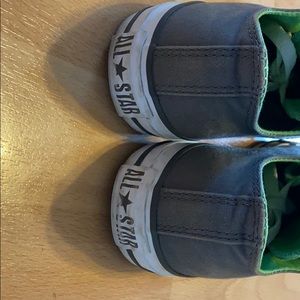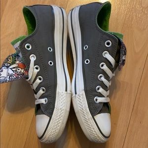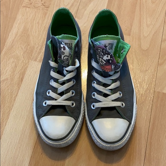 Grey converse with green interior. Two shoe tongues - patterned and green.