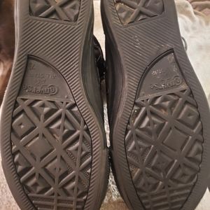 All star All black Converse worn about 5 times sole on one shoe has rubber opening was like that when bought them doesn't effect you worn them foot doesn't get wet at all I think it was just the rubber not fill in all the way when made. Mens 7.5 Women 9.5