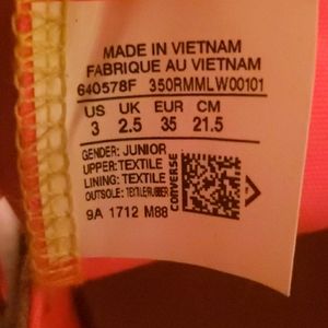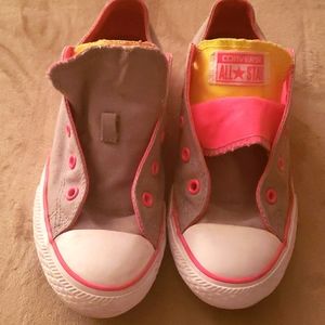 Converse multi color grey, pink, and yellow, double tongue like new... she never actually wore these, however she did take the shoe laces out. I am happy to pick up a pair to ship with them on a full price offer. Otherwise these shoes are perfect and soooo cute!