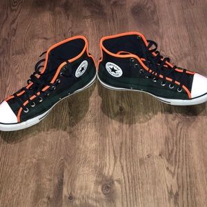 Dark green, navy blue, black plaid with neon orange trim. World peace sign on side. Worn twice. Few light scuff marks on toes. Soles fully in tact. Great condition