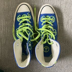 Open to offers. Super cute blue and neon peace sign converse. Retail for about $80 and are super uncommon for other people to have!! Loved these but they’re a little small. In great condition!