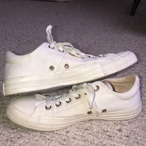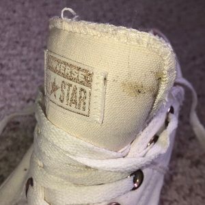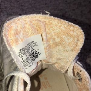 Great condition with just a small spot on the tongue of the right shoe (can’t really see it when on). They have gold eyelets and a pinkish/orange interior design. They are a size nine (25.5 cm). They aren’t the typical pure white converse, a little more off white