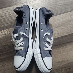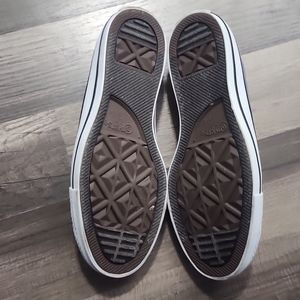New wo tags converse. I bought them to wear for a wedding so I only had them on maybe on maybe 2 hours. the heel fabric stretches. No stains, smoke free home.