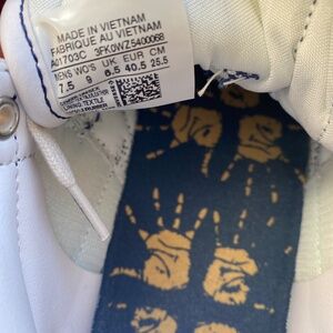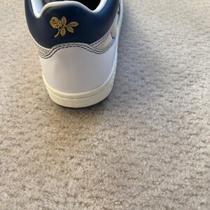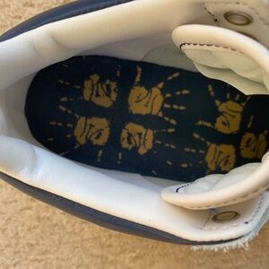 Converse skate shoe size 7.5 men’s and 9.0 women’s as seen on tag. Not worn much as you can see by photos. Navy blue, cream and white