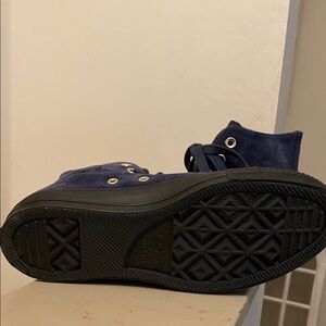 Dark blue suede high-tops with black rubber soles. Iconic Converse style with metal eyelets. Size 8. Worn once.