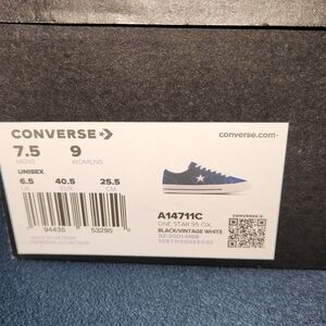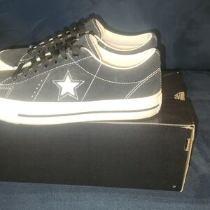 New, never worn Converse One Star sneakers. Black upper with white accents. Perfect for casual wear. Men's size 7.5, Womens size 9.