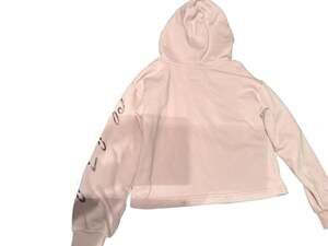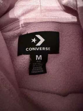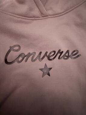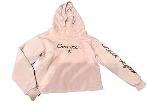 Converse Girls Pullover Hoodie, Pink with Metallic Script, Size Medium (10-12 Years). This stylish sweatshirt features a classic fleece-lined interior for warmth and a cropped-style hem. It showcases the Converse logo and star on the front in a metallic finish, with 'Chuck Taylor' script along the sleeve. Made from a comfortable 60% cotton and 40% polyester blend. Excellent pre-owned condition with no visible flaws, stains, or holes. Perfect for school, sports, or casual streetwear.