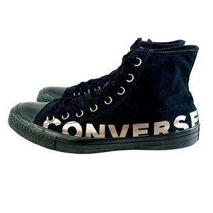Classic high-top Chuck Taylor All Star sneakers with canvas construction and bold silver side branding. Features black rubber toe caps, black eyelets, and durable rubber outsoles.