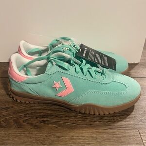 Colorway: Eye-catching Mint Green/Teal suede upper with striking Pink/Coral accents on the heel tab and Converse Star/Chevron logo.