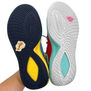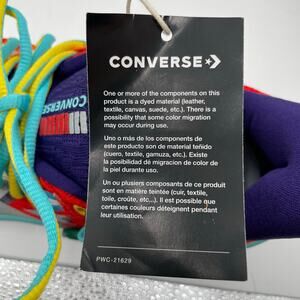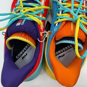 Coveted pair of Converse’s take on the “What The” style in a Fever Dream / Dial Up Blue colorway. That’s mismatched red + blue uppers, purple + orange tongues, guards, and insides, light blue and yellow laces and heel details, and CX foam for comfort on and off the court. Heels read Home Is Where The Hardwood Is. Limited edition drop from Feb 2024. Wicked hard to find!