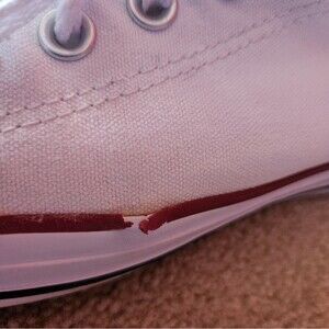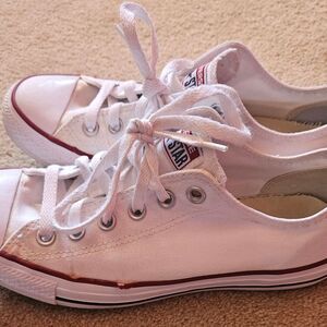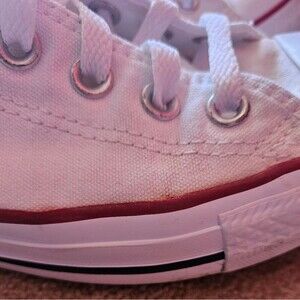 Converse All Star Chuck Taylor style white sneakers with red stripes. Flaws as noted in pictures.