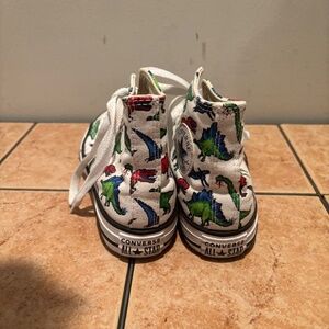 Converse All Star Hi Chuck Taylor Dinosaur Sneakers. Canvas upper. Lace up. Kids size 1. White cap top and midsoles hare dirty otherwise good condition.