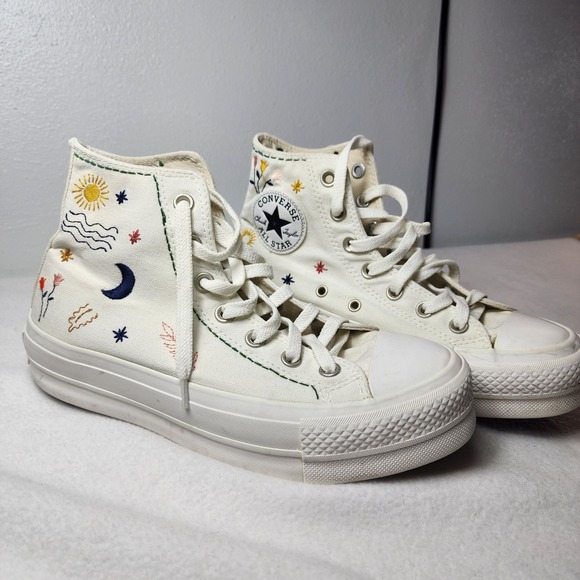 Keywords: platform sneakers, embroidered shoes, celestial print, floral details, canvas sneakers, fashion sneakers, casual shoes, streetwear, youthful style, designer inspired, summer footwear, spring style, unique design, converse, all star, high top, embroidered, cosmic, sun, moon, celestial, stars, canvas sneakers, white, womens 5, astrology, indie, cottagecore, y2k vibe, embroidered shoes