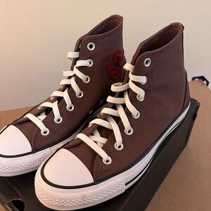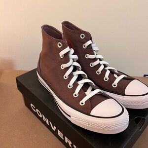 Classic Converse high-tops in dark brown. Features iconic logo and white sole.