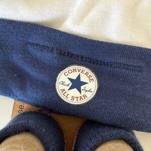 NEW with Tags this adorable Converse All Star Infant Hat & Booties Set. Includes navy and white logo beanie with matching logo sneaker booties. Perfect for your future athlete. Baby Shower - Newborn Gift. Size 0-6 Months Old.