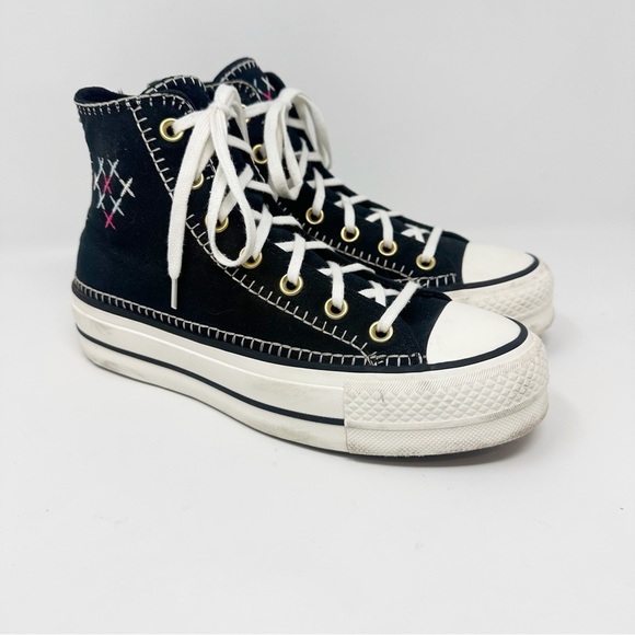 Very clean. Only worn a couple times. Embroidered details and a floral embellishment at heel. Round toe.