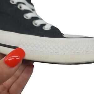 Good condition perfectly worn for a grunge look Converse mens size 10 shoes. Some of the fabric has faded as shown, some wear on the white rubbers, some wear on the insoles, one small hole shown by one shoelace eyelet.