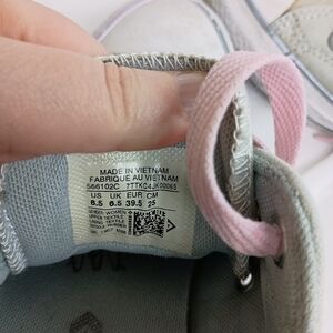 Converse All Star sneakers in mint green with pink laces. Classic and stylish.