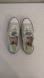 Light mint green canvas, white rubber toe caps & soles, with black trim. White lace up closures, with knotted ends. Pull tabs, and cinched heels, for easy slipping on/ off. Unisex.