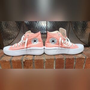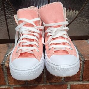 Trendy Converse high-tops in a soft peach hue called lawn flamingo. Ideal for everyday wear. just didnt work against my skin color