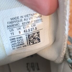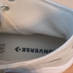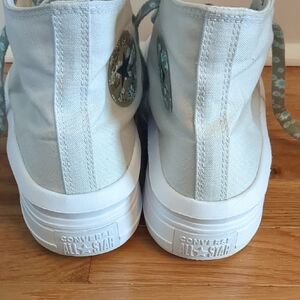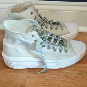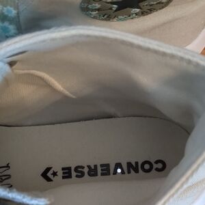 Classic Converse high-top silhouette with raised platform sole. Cream canvas upper with decorative floral-patterned laces. Iconic Converse star patch on the ankle. Clean, versatile design for casual wear.