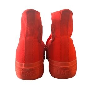 Bold and stylish Converse Chuck Taylor All Star high tops in a striking Neon Orange colorway. Classic canvas upper, matching sole, and metal eyelets for the iconic look. Some light scuffs on the sole (see photos) but uppers are clean.