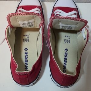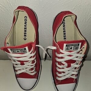 Classic Converse All Star sneakers in vibrant red. Features white laces and rubber soles.