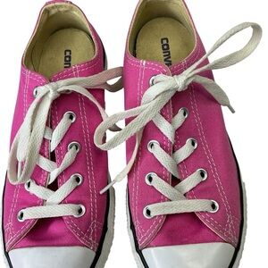 The pictures are of the actual item you will receive. In very good condition showing few surface marks or signs of previous use and wear (as shown in the pictures provided). Vibrant pink Converse sneakers. Features white laces and stitching. Iconic All Star branding. From a pet friendly and non-smoking household.