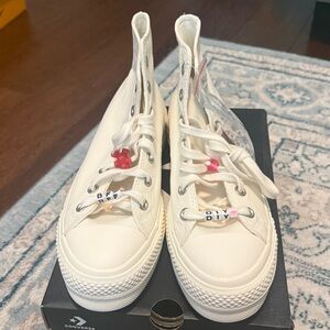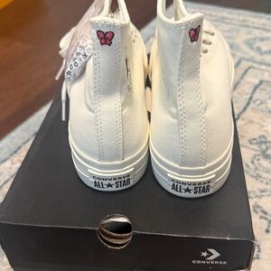 Stylish white Converse high-tops. Features classic logo patch and durable canvas material.