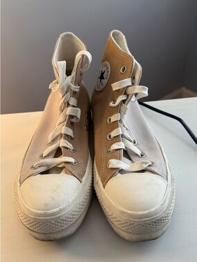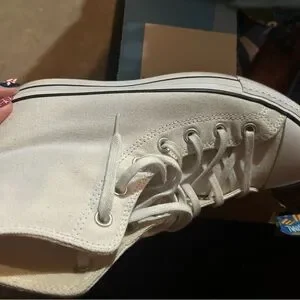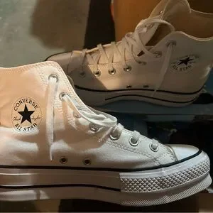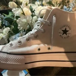 Classic white Converse high-tops. Iconic design with durable canvas-very customizable if you wish! Perfect for everyday wear or under your wedding dress like I did! The lift sole made them a seamless transition from my heals under the dress!